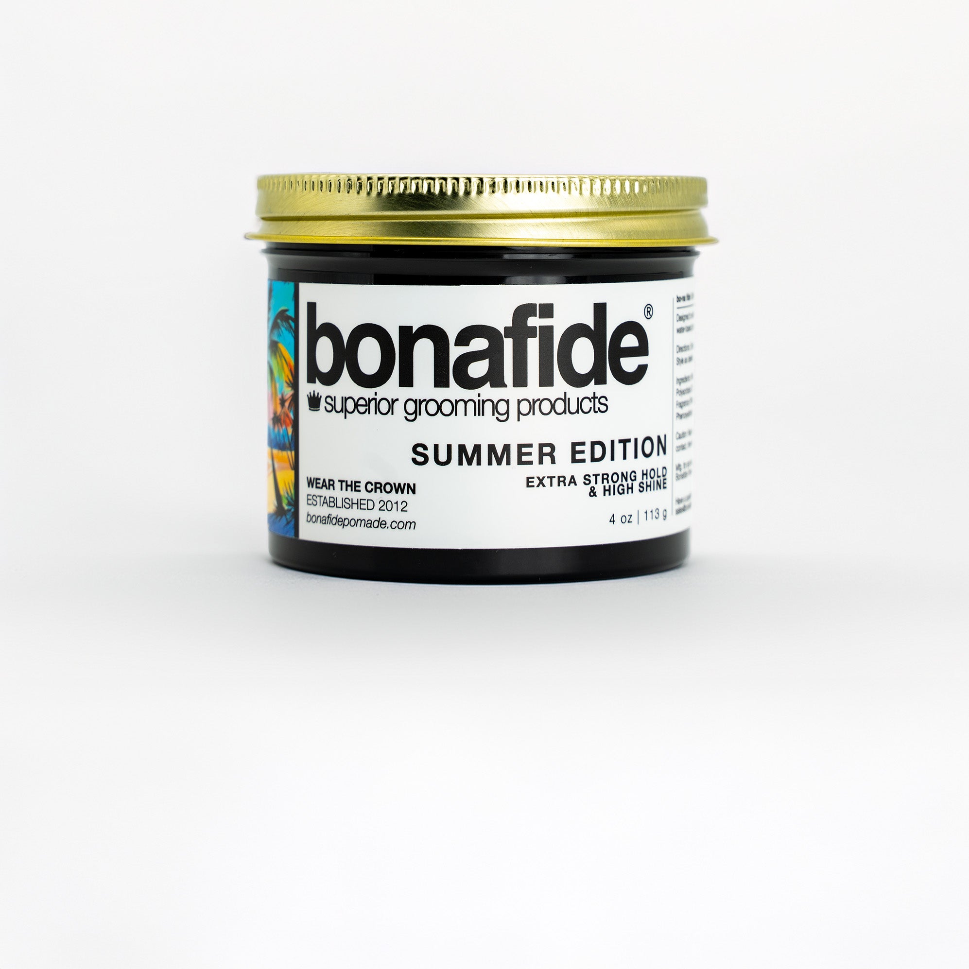 Bona Fide Summer Edition Pomade locks my hair in place with extra-strong hold yet rinses out under one shampoo—no waxy buildup. The pleasant pineapple-melon scent leans sweet but fades after an hour or so. Four ounces cost less than many salon brands and the water base means easy restyling with a splash of water.