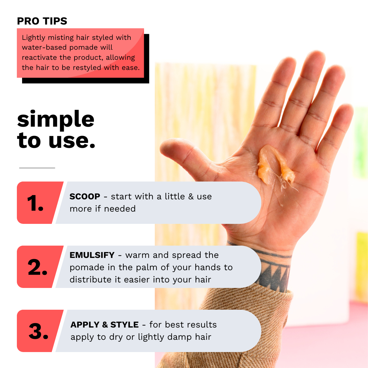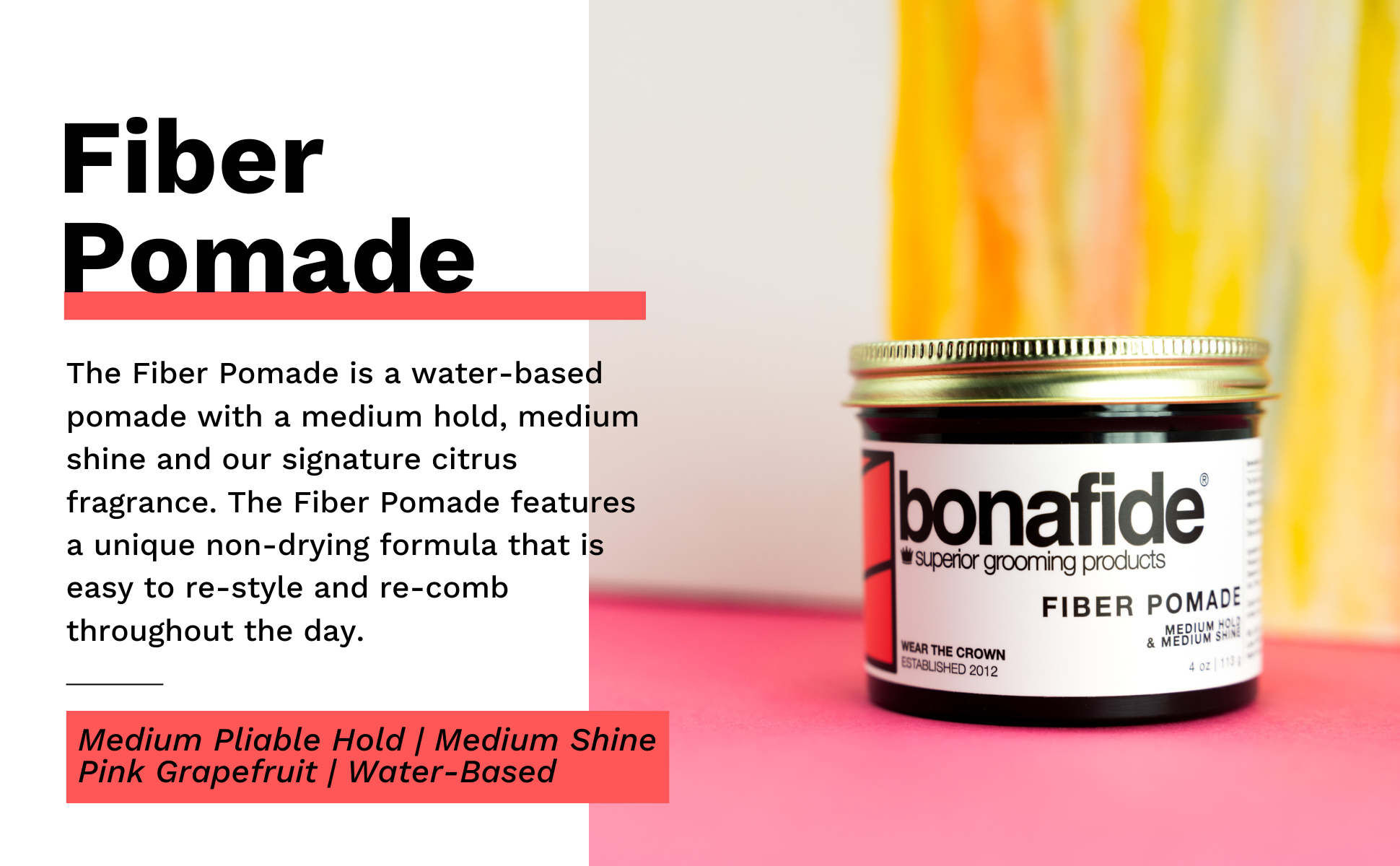 The Fiber Pomade is a water-based pomade with a medium hold, medium shine and our signature citrus fragrance. The Fiber Pomade features a unique non-drying formula that is easy to re-style and re-comb throughout the day.