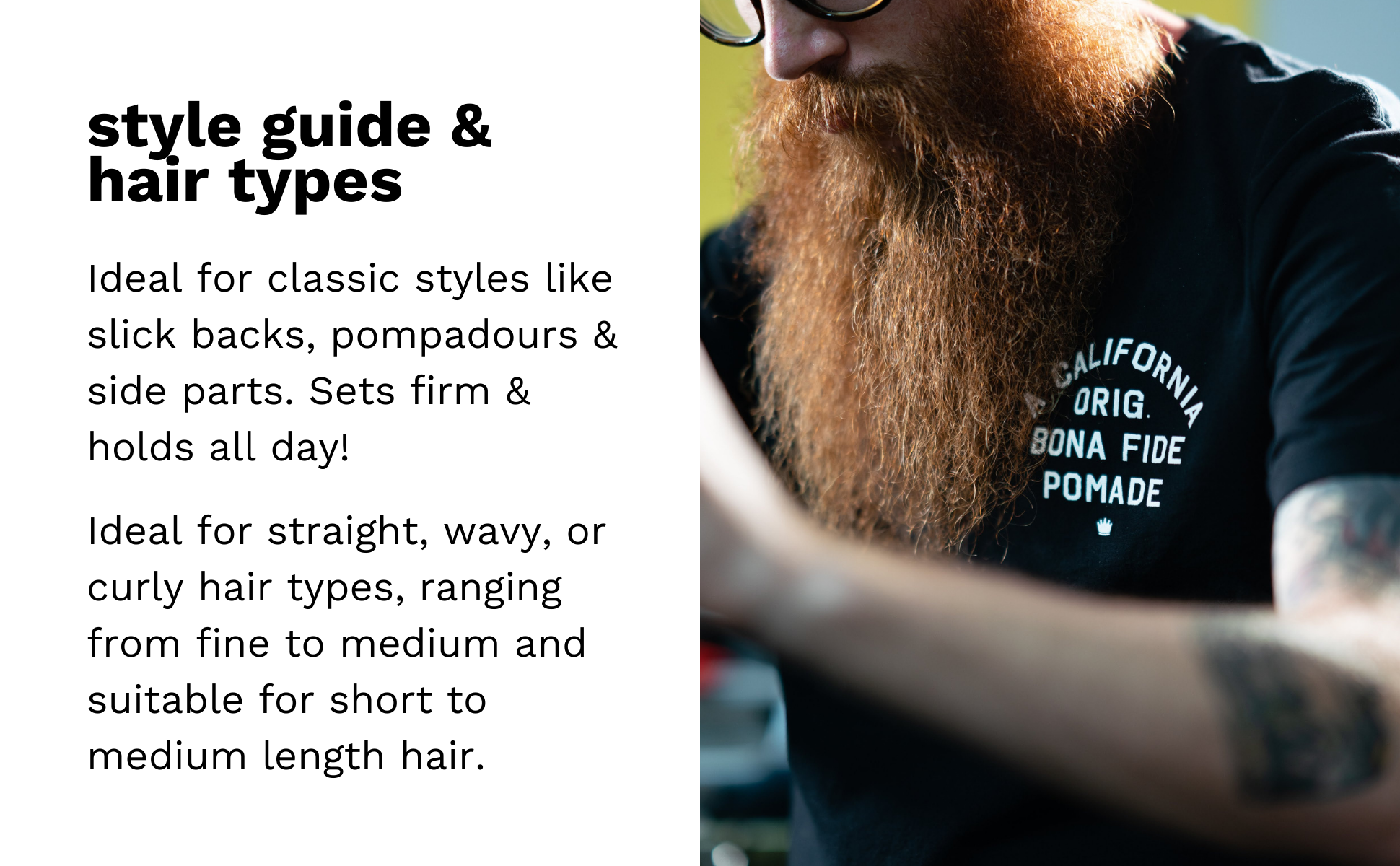 Style Guide:  Ideal for managing and styling pompadours, side-parts & slick-backs