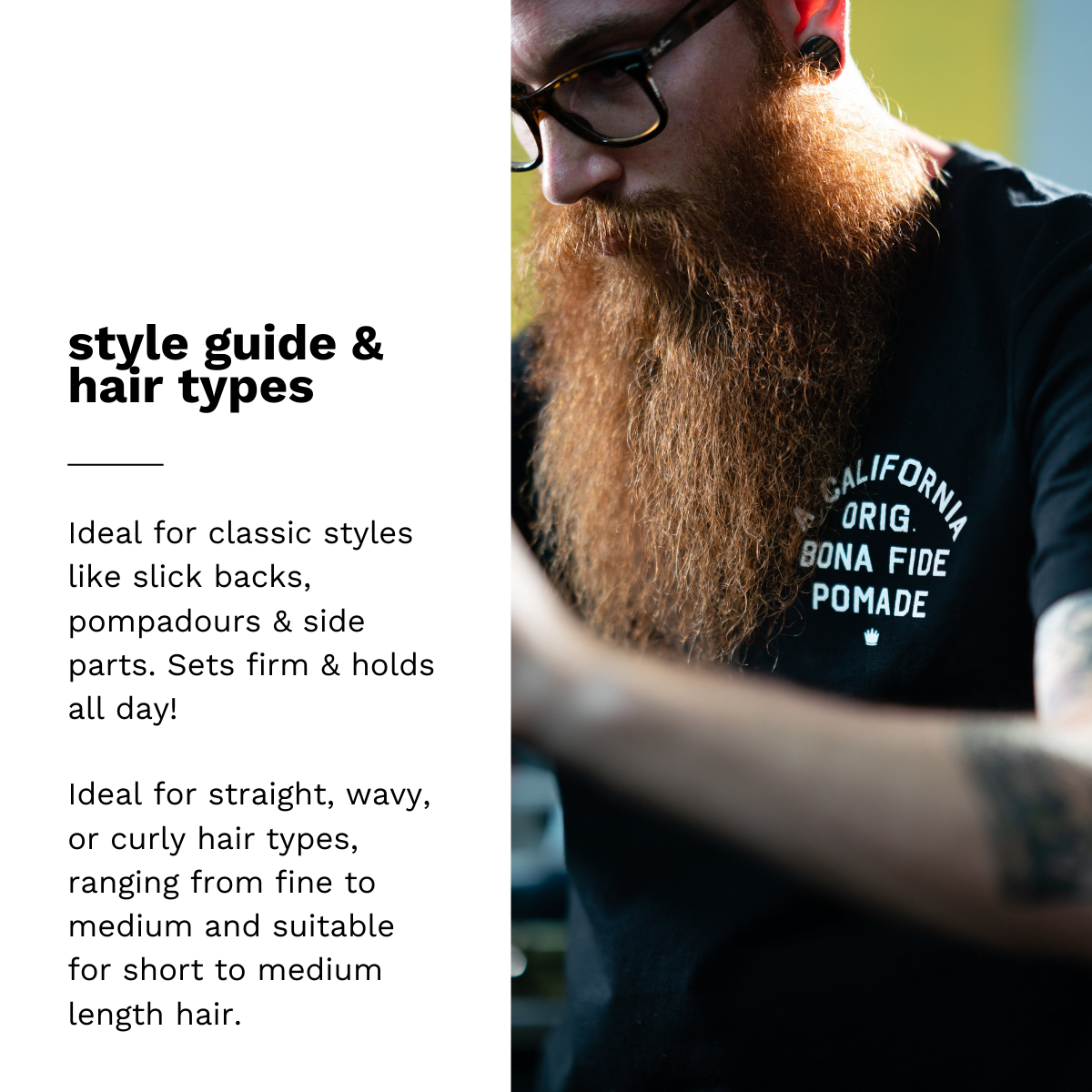 Style Guide:  Ideal for managing and styling pompadours, side-parts & slick-backs