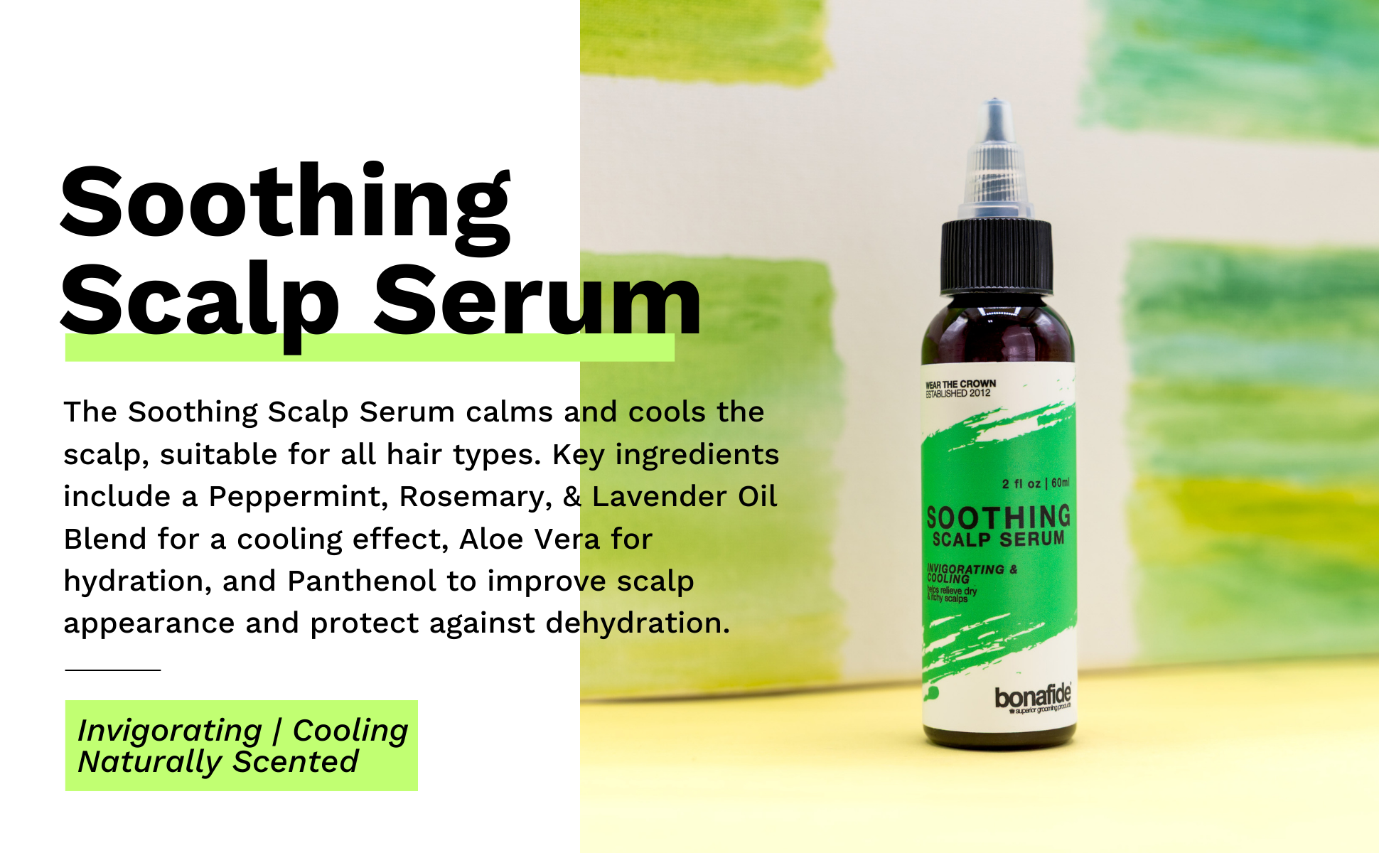 The Soothing Scalp Serum calms and cools the scalp, suitable for all hair types. Key ingredients include a Peppermint, Rosemary, & Lavender Oil Blend for a cooling effect, Aloe Vera for hydration, and Panthenol to improve scalp appearance and protect against dehydration.