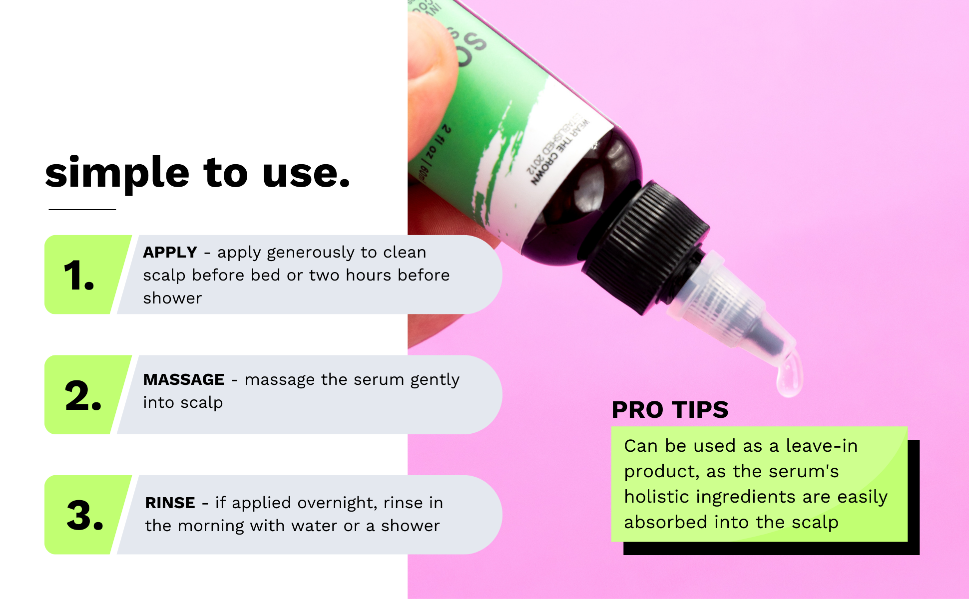 - Before Bed: Apply generously to a clean scalp (after a shower) before bed. Massage Soothing Scalp Serum into your scalp and rinse off in the morning.