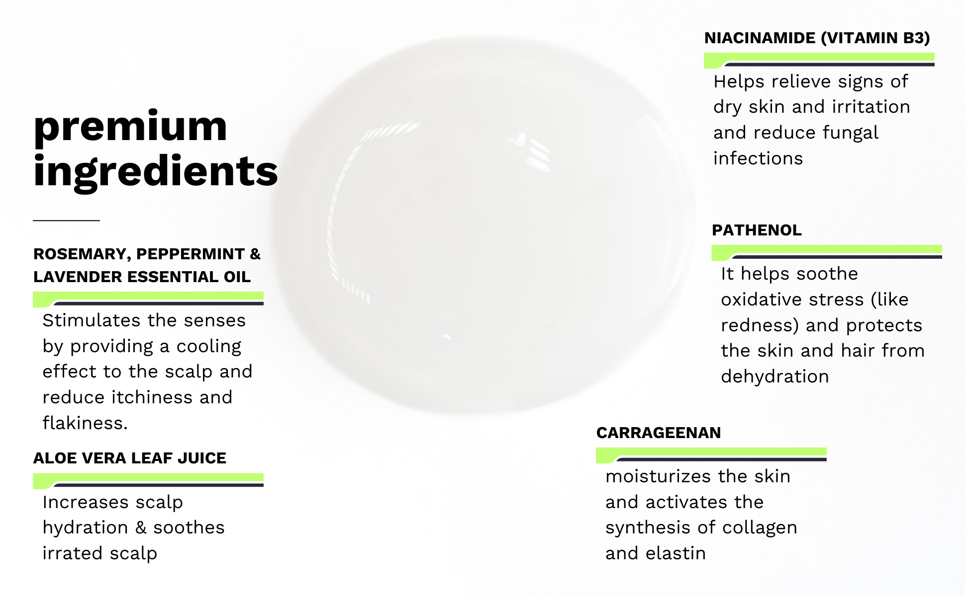 Water, Glycerin, Polysorbate 20, Propanediol, Niacinamide, Xantham Gum, Carrageenan, Sodium Citrate, Aloe Barbadensis Leaf Juice, Panthenol, Ricinus Communis (Castor) Seed Oil, Rosmarinuss Officinalis, Lavandula Hybrida Oil, Mentha Piperita (Peppermint) Oil, Menthyl Lactate, Citric Acid, Serenoa Serrulata Fruit Extract, Taraxacum Officinate (Dandelion) Extract